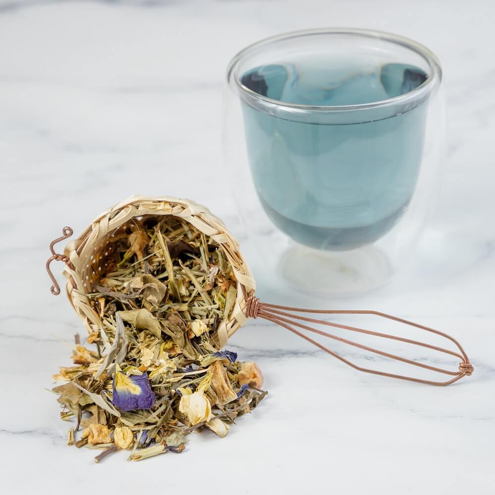 A infusão é composta por chá branco, capim-limão, artemísia, maçã, jasmim, sálvia e clitória. Uma combinação perfeita para trazer luz às potencialidades do signo.